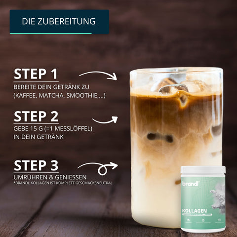 Für die tägliche Einnahme empfehlen wir 10-15 g Kollagenpulver. Es ist vielseitig einsetzbar und lässt sich problemlos in Wasser, Kaffee, Smoothies, Joghurt oder beim Kochen und Backen integrieren.