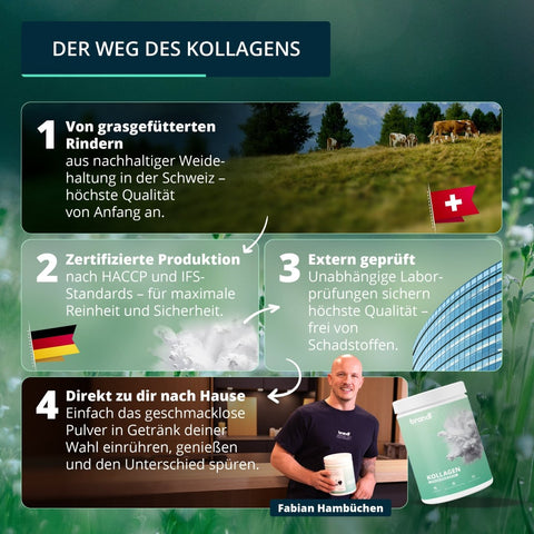 Für unser Produkt verwenden wir Kollagen von grasgefütterten Rindern aus artgerechter Weidehaltung in der Schweiz, das unter strengen Standards verarbeitet wird. Anschließend erfolgt die Abfüllung in Deutschland – für ein Produkt, auf das du dich verlassen kannst.