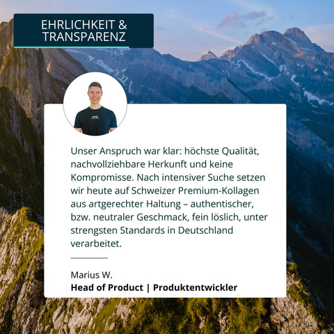 Für unser Produkt verwenden wir Kollagen von grasgefütterten Rindern aus artgerechter Weidehaltung in der Schweiz, das unter strengen Standards verarbeitet wird. Anschließend erfolgt die Abfüllung in Deutschland – für ein Produkt, auf das du dich verlassen kannst.