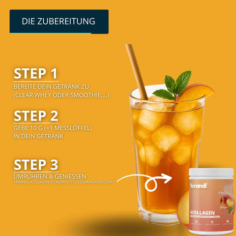 Entdecke das brandl® Premium Kollagen aus der Schweiz – jetzt in drei Varianten: neutral, Schokolade und Pfirsich. Hergestellt aus den hochwertigen Kollagenpeptiden COLLATIS™ 2000 BLD der Marke COLLAswiss®, bietet es dir maximale Reinheit und Vielseitigkeit. Mit einem optimalen Molekulargewicht von 2.000 Dalton überzeugt es durch besonders hohe Bioverfügbarkeit und lässt sich mühelos in deine Ernährung integrieren.
