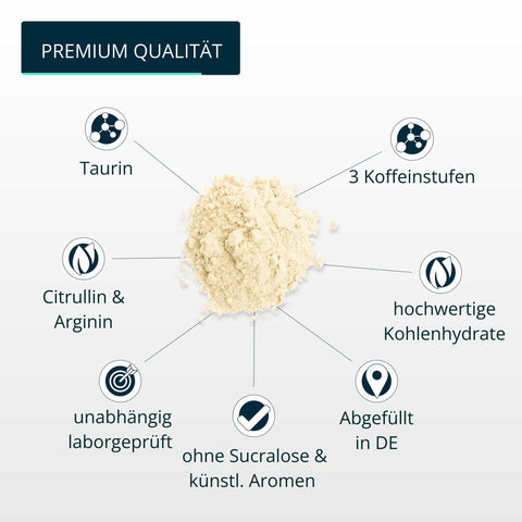 Neben der individuell einstellbaren Koffeinmenge überzeugt unser PreWorkout durch eine durchdachte Rezeptur: Isomaltulose als hochwertige Kohlenhydratquelle, L-Citrullin-DL-Malat und L-Arginin als bewährte Aminosäuren sowie Taurin und Totes Meersalz für eine abgerundete Zusammensetzung. Natürliches Koffein aus Kaffee, Guarana- und Mateblatt-Extrakt sorgt für eine stufenweise Freisetzung.