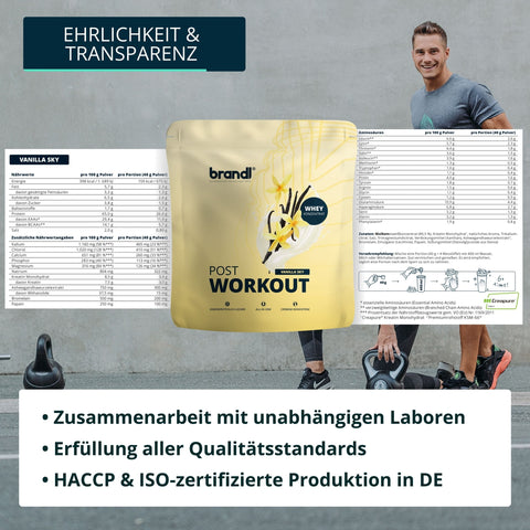 Abgefüllt in Deutschland unter höchsten Qualitätsstandards, steht unser Post-Workout Shake für Transparenz und Qualität. Er ist der ideale Begleiter für alle, die nach dem Training das Beste aus ihrer Regeneration herausholen möchten.